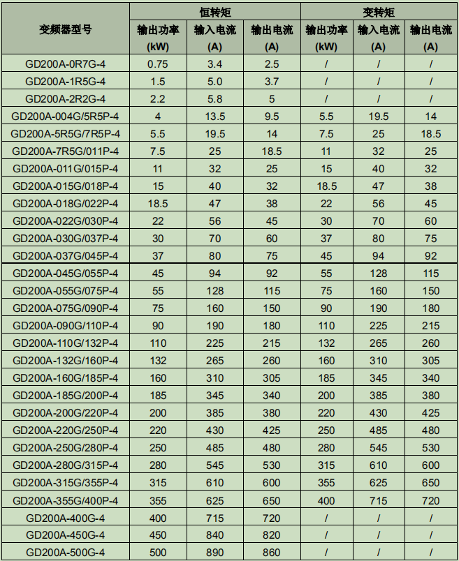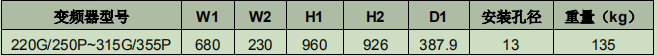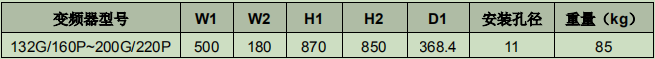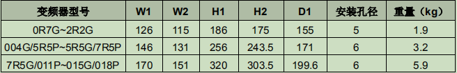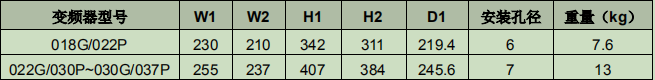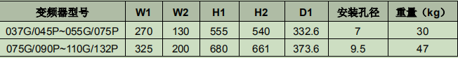 ① 产品特点: 产品可实现准确的参数自学习,提供优异的电机驱动性能。 产品设计严格遵循IEC国标标准,并通过了CE认证测试。 产品采用拉铆式结构设计,内置可选C3滤波器,EMC性能更优秀,使产品在电磁干扰场合同样适用。 0.75- 30kW变频器内置制动单元,15kW (含)以下标配贴膜接盘(可接外引键盘),18.5kW(含)以上标配可插拔键盘,控制端子板可插拔,极大方便客户使用和操作。 产品支持共直流母线方案,支持直流供电模式,可提供直流、能耗、短路和磁通四种制动方式,具有简易供水、瞬时掉电不停机等多种功能,可较好地满足客户各种使用需求。 产品为半书本型结构、独立风道设计,支持壁挂、法兰、落地安装方式,为客户提供更可靠、更经济的安装使用方式。 优异的开环矢量控制性能:0.5Hz/150%启动转矩,1:100调速。 产品广泛用于空压机、塑料机械、石油、矿用、暖通供水、风机水泵等。 ② 产品规格: AC 3PH 380V(- 15%) ~440V(+10%) 0.75~ 500kW ③ 型号规格 ④ 壁挂安装尺寸 0R7G~015G/018P 壁挂安装示意图 018G/022P~030G/037P 壁挂安装示意图 037G/045P~110G/132P 132G/160P~200G/220P 壁挂安装示意图 220G/250P~315G/355P 壁挂安装示意图